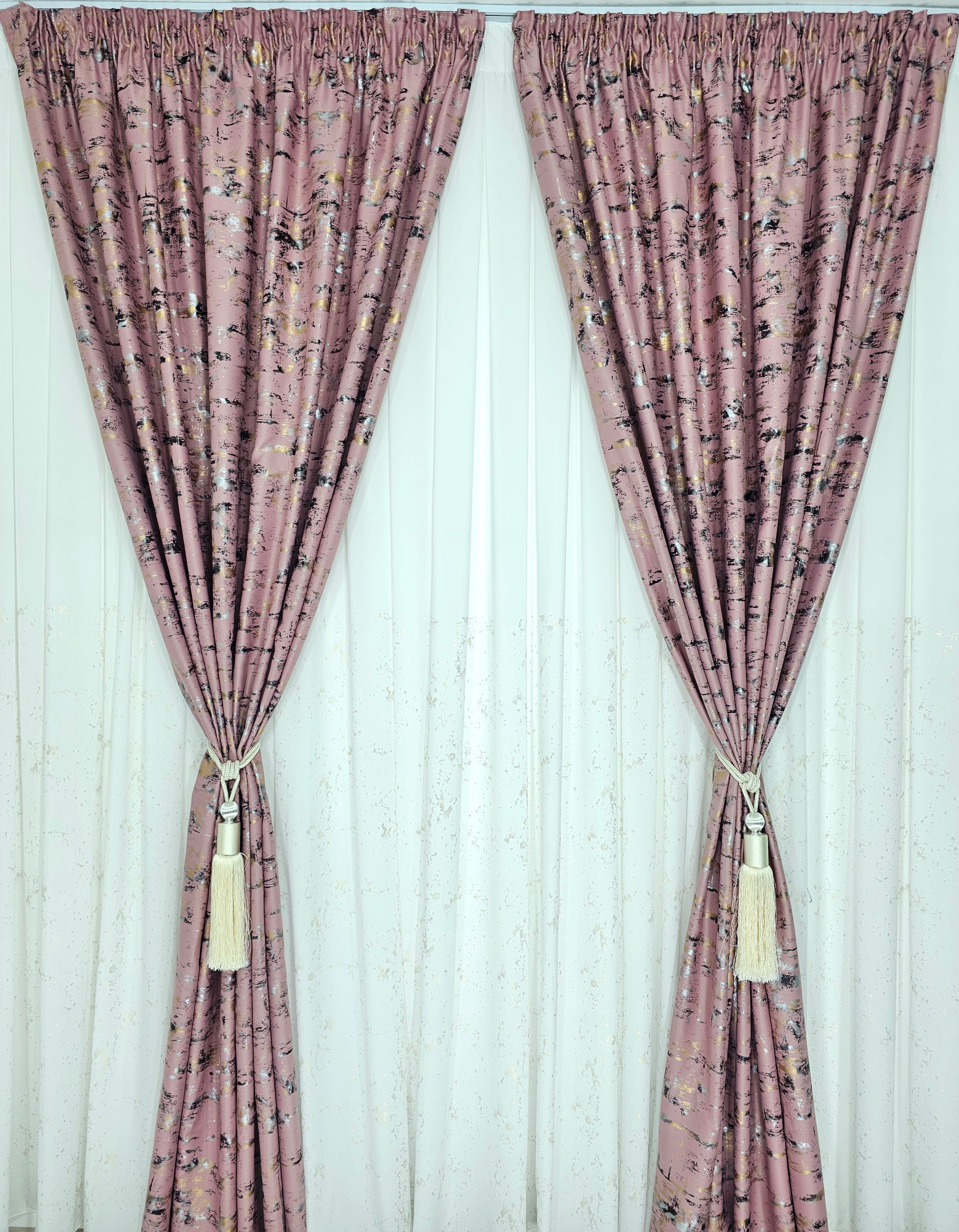 Acest set spectaculos îmbină delicatețea perdelei din mătase fină cu inserții aurii subtile, ce reflectă lumina într-un mod rafinat, cu opulența draperiei roz blackout 90%, decorată cu inserții aurii elegante. Împreună creează un ambient luminos, sofisticat și plin de personalitate, potrivit pentru interioare moderne sau clasice.