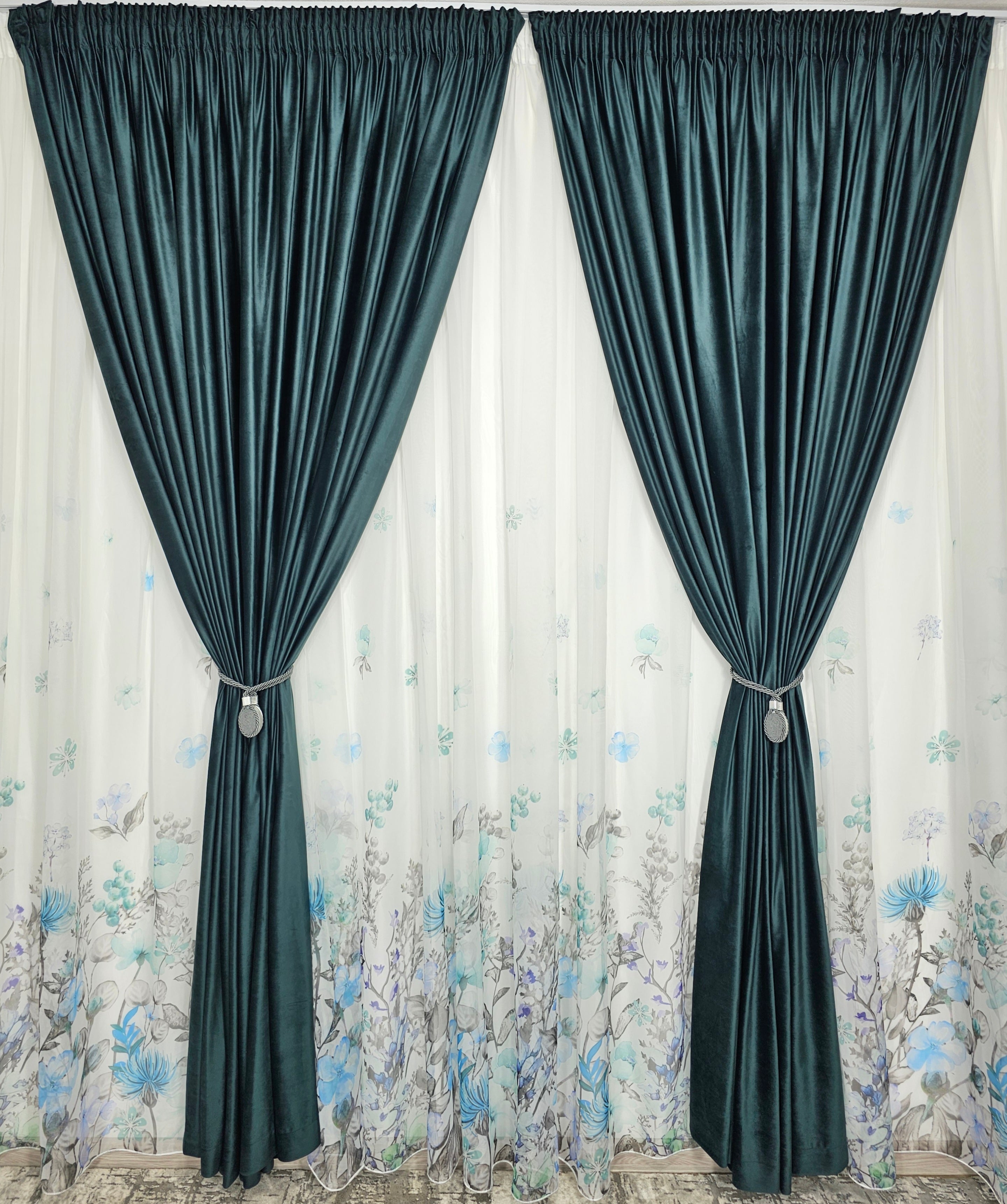 Set Perdea Floral Gri-Albastru & Draperie din Catifea Verde