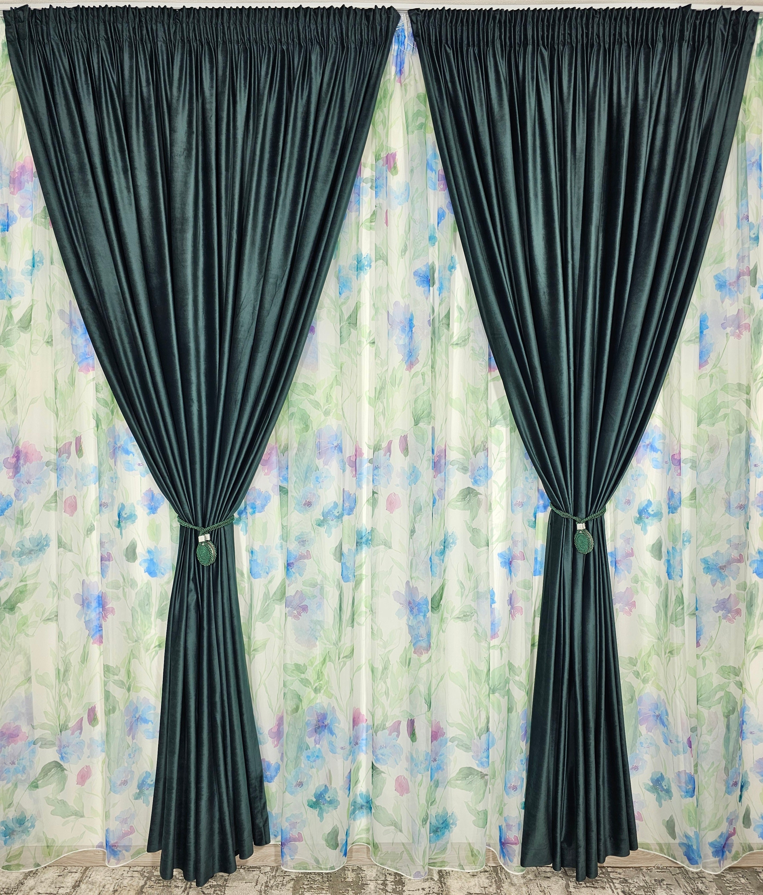 Set Perdea Floral Verde-Mov-Albastru & Draperie din Catifea Verde