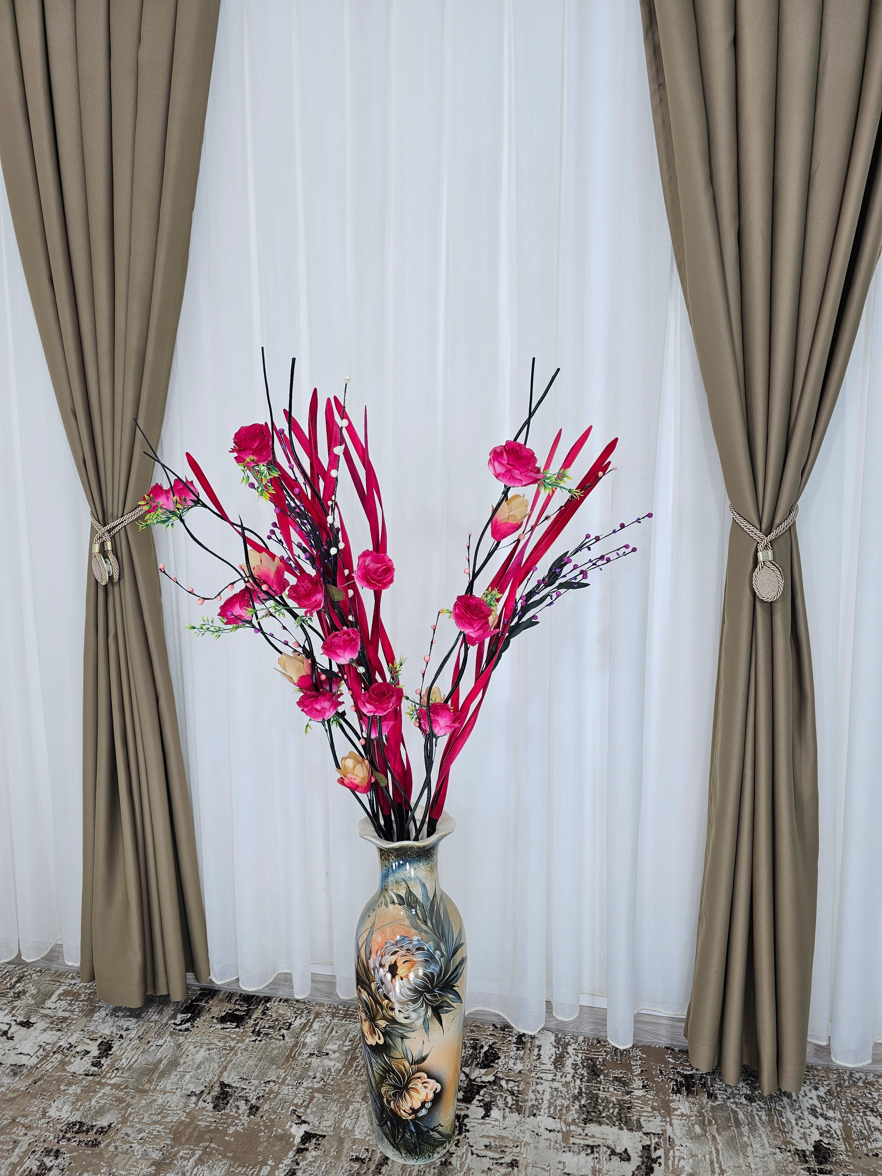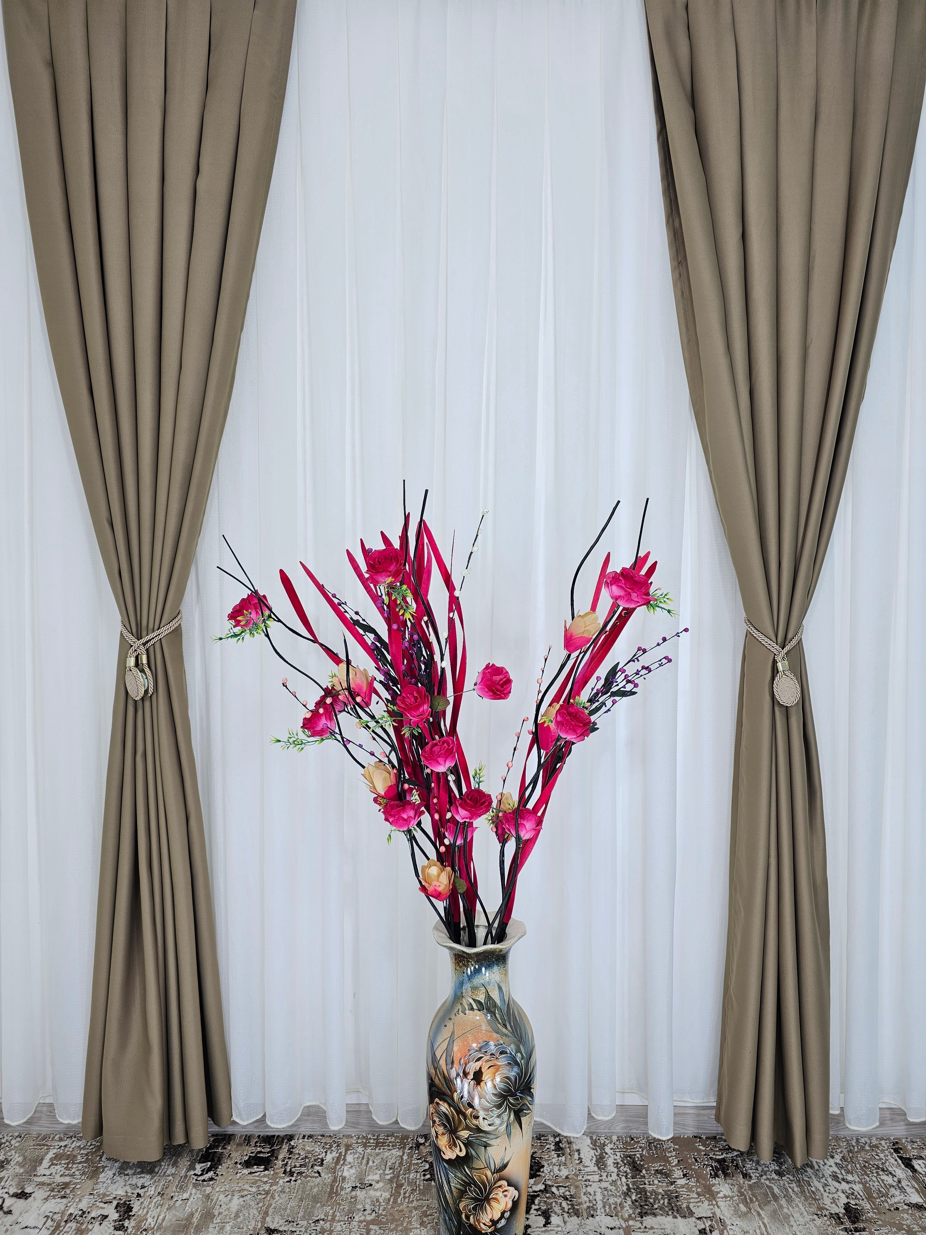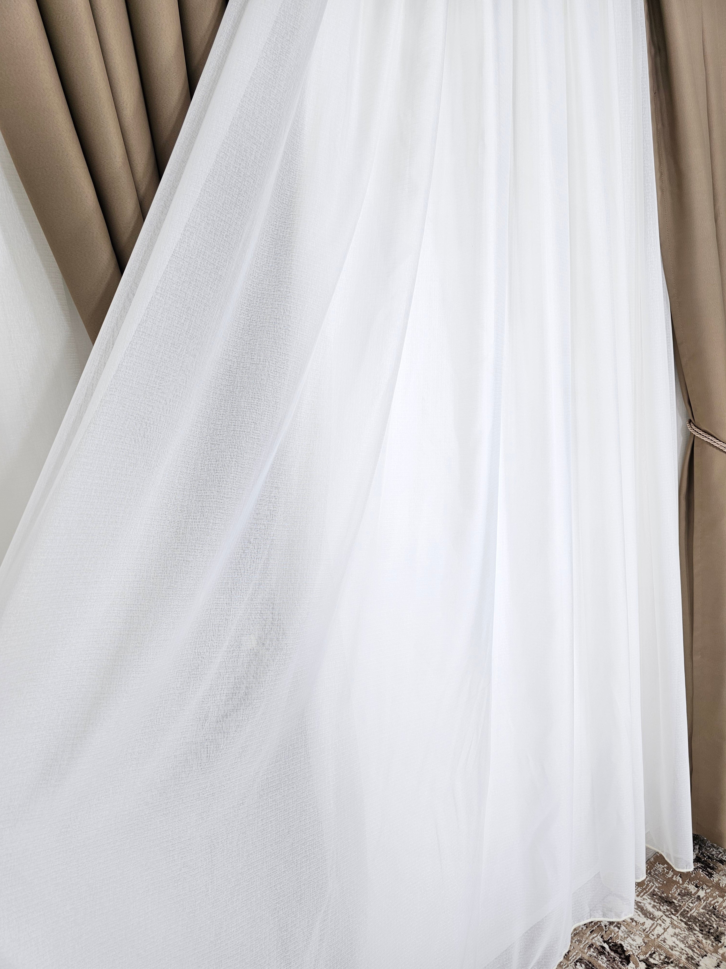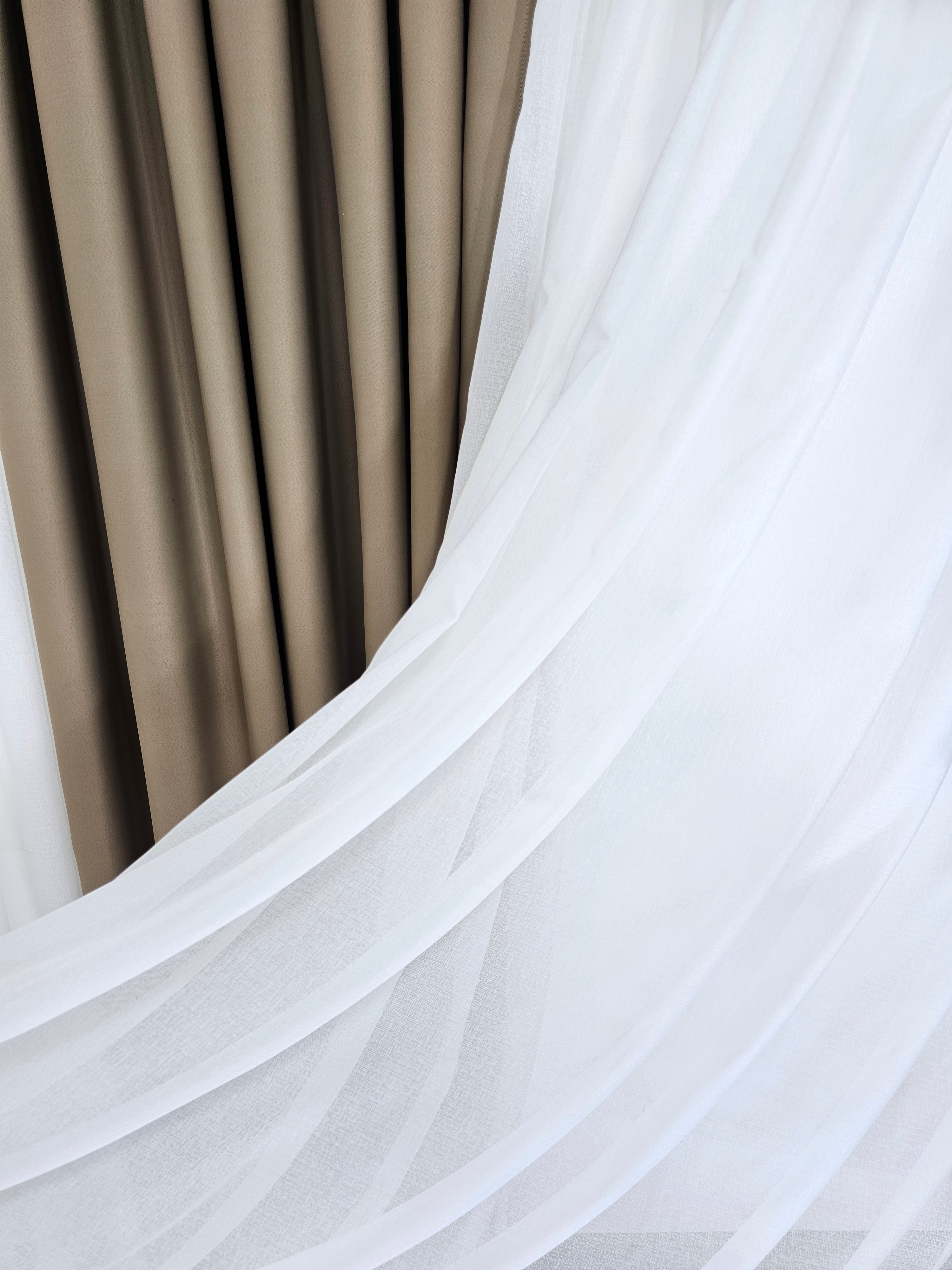 Acest set combină frumusețea naturală a perdelei tip in cristal, cu textură plină și aspect rafinat, cu draperia simplă blackout grej 90%, ce asigură echilibrul perfect între lumină și intimitate. Materialul nesifonabil al perdelei aduce un plus de confort și ușurință în întreținere, păstrând mereu un aspect impecabil.