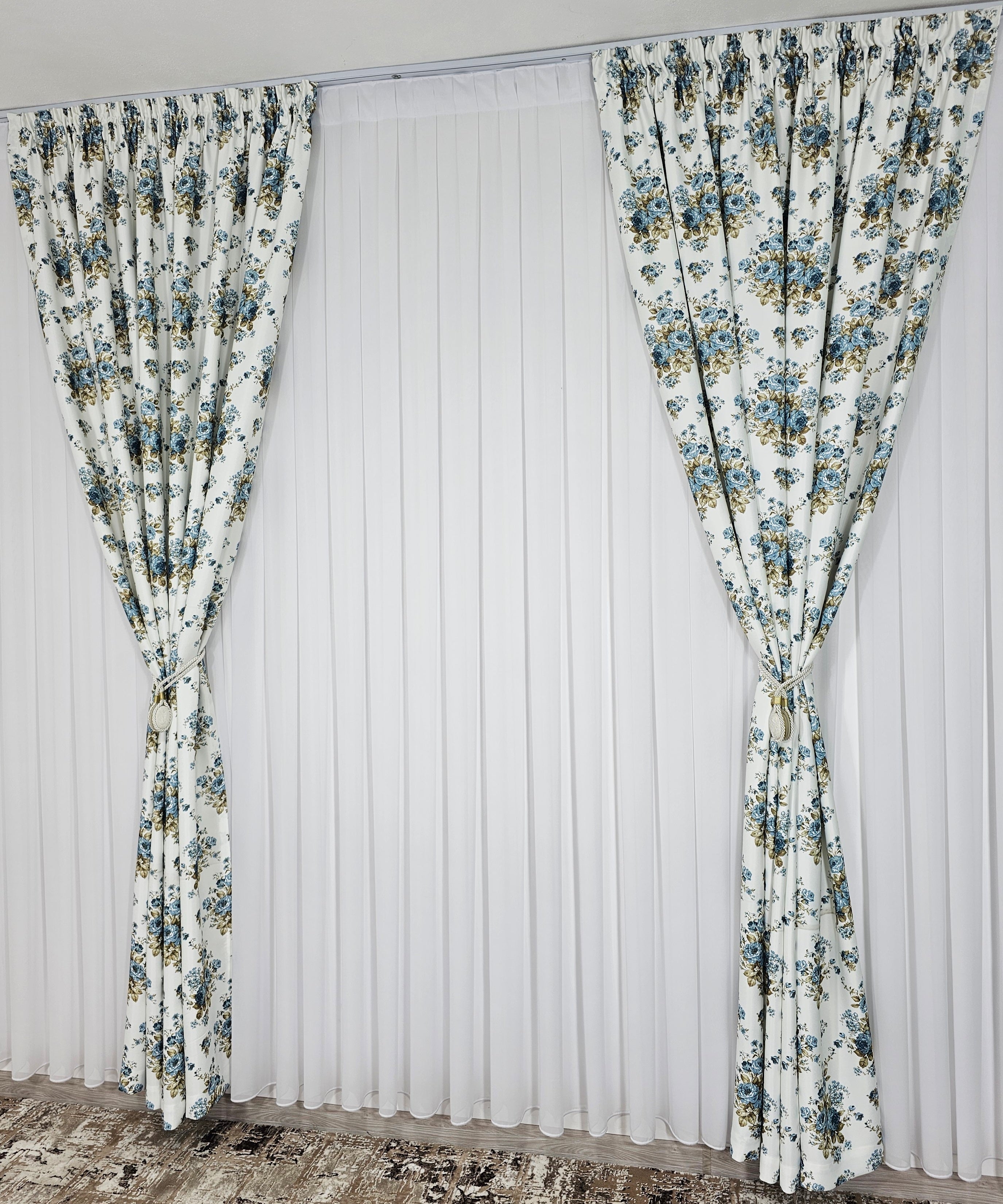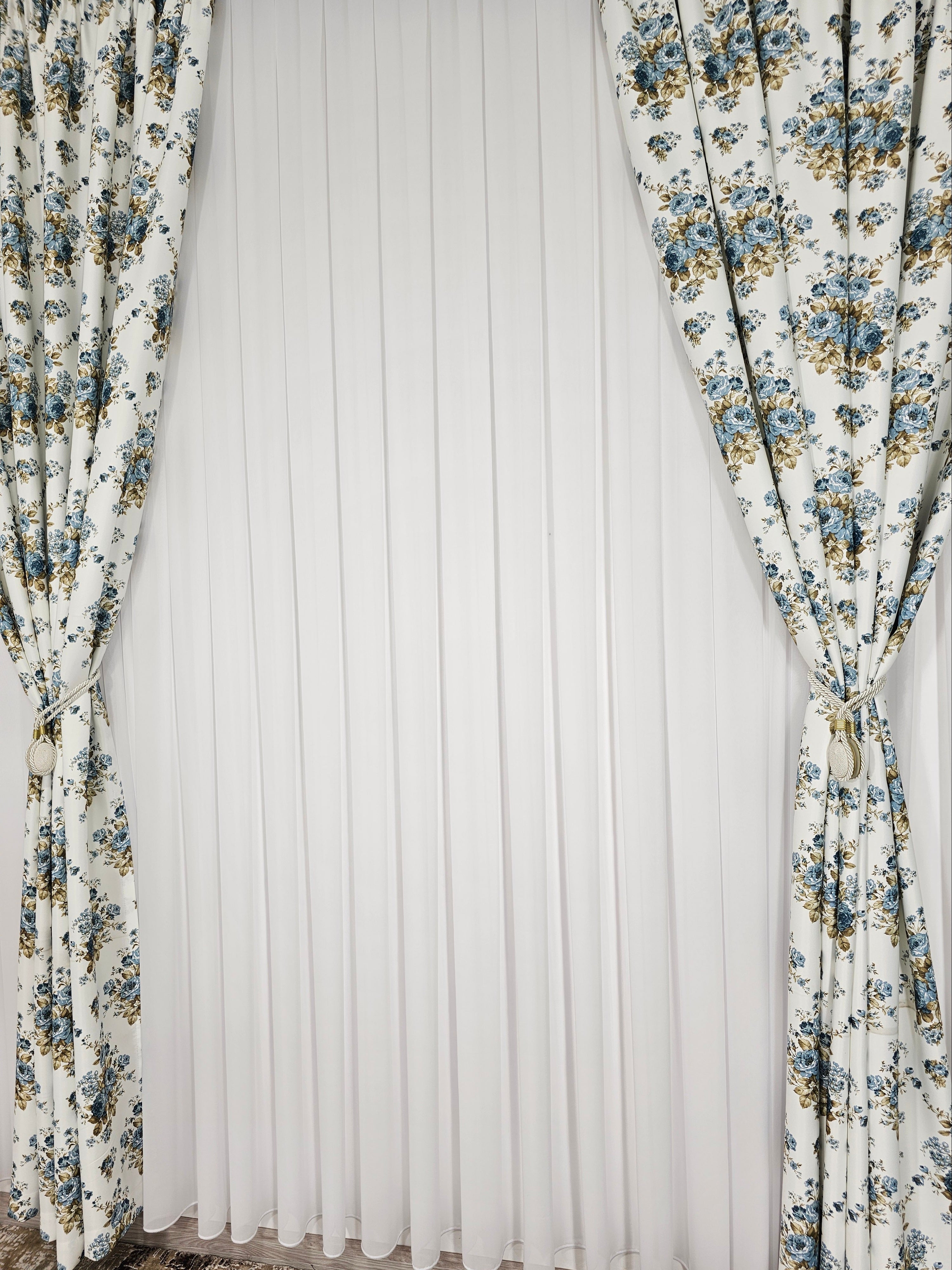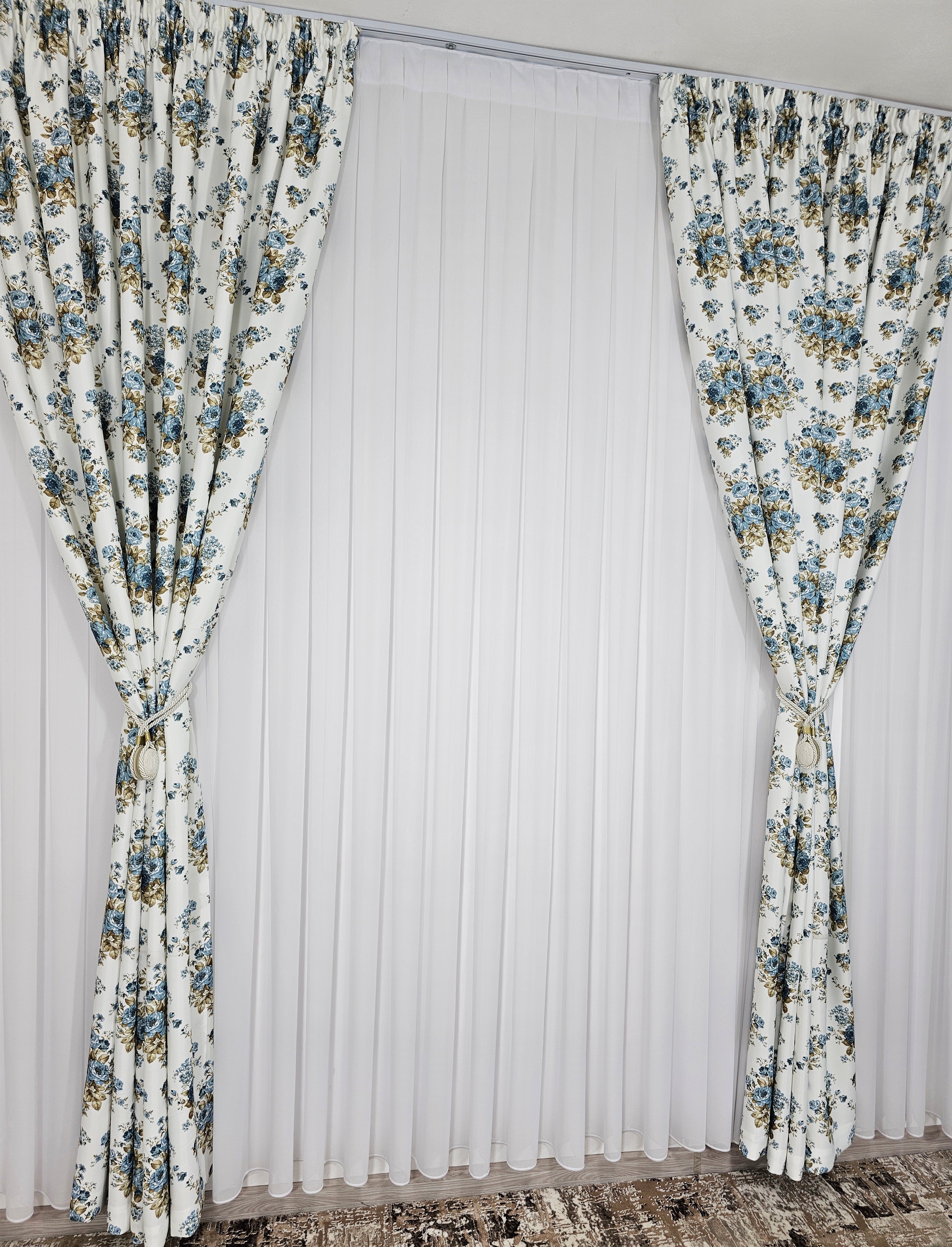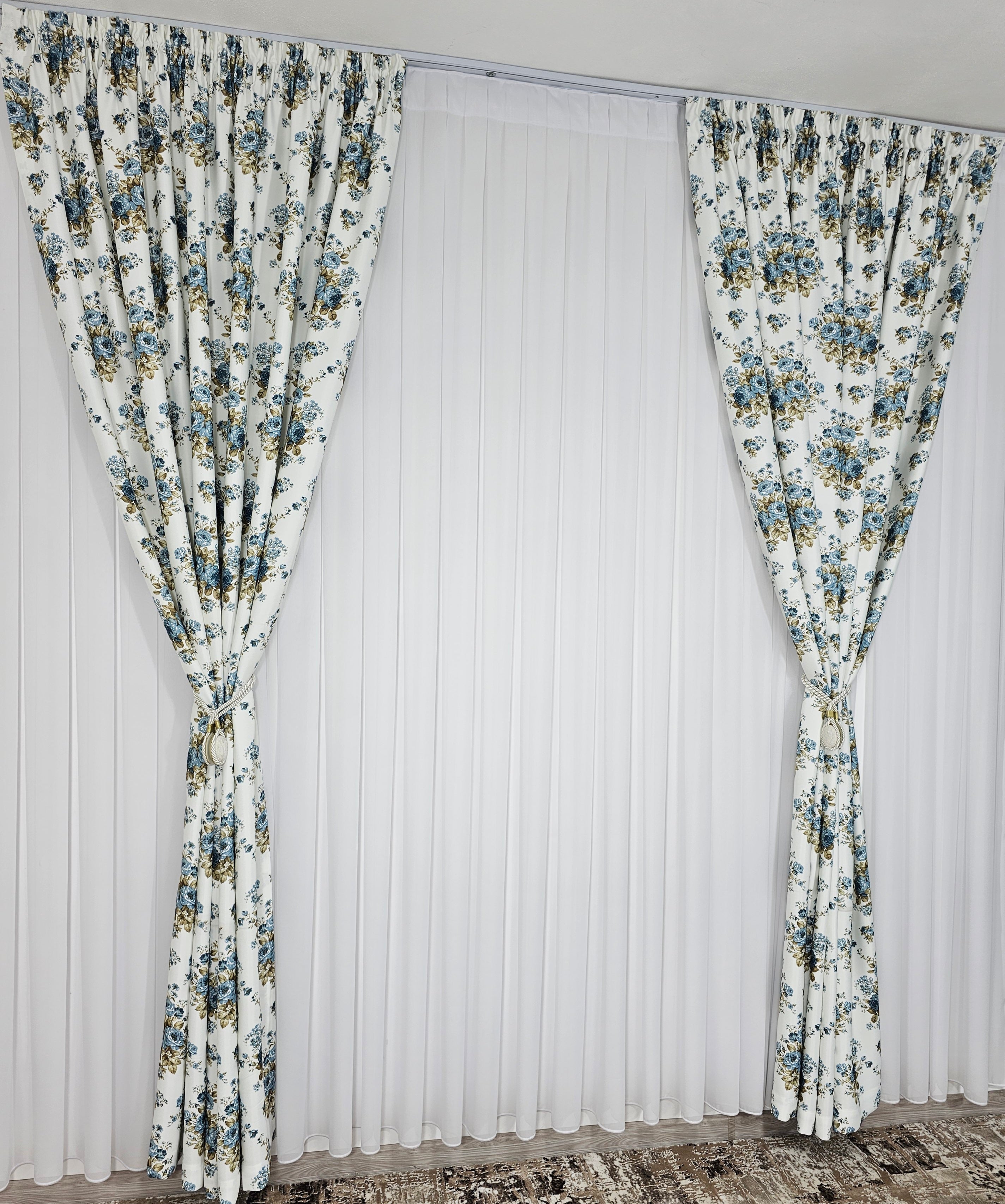Un set plin de rafinament, format din perdea albă ușoară cu imprimeu floral și draperie asortată în același model, ideal pentru a adăuga prospețime, eleganță și armonie în decorul casei tale.