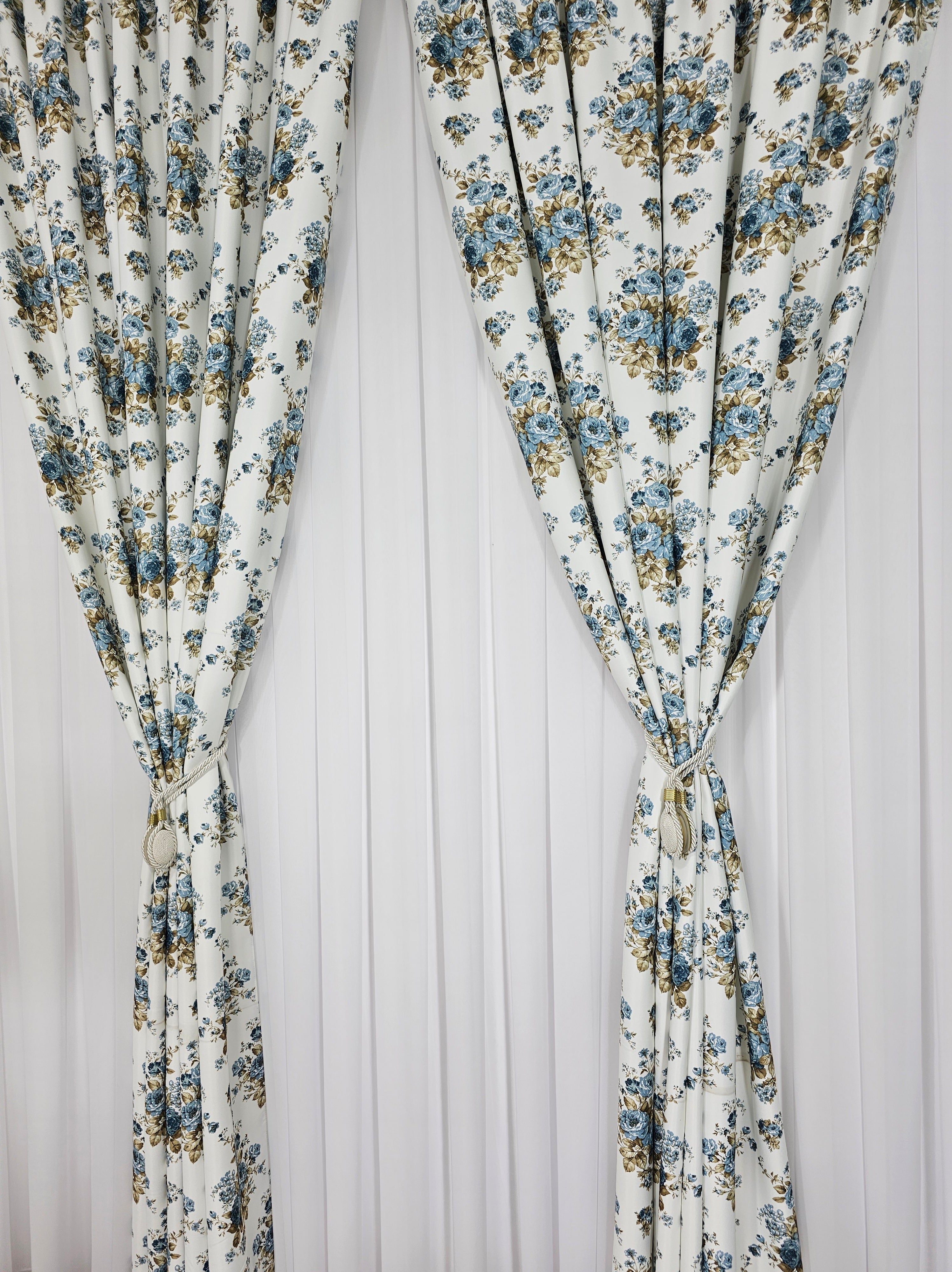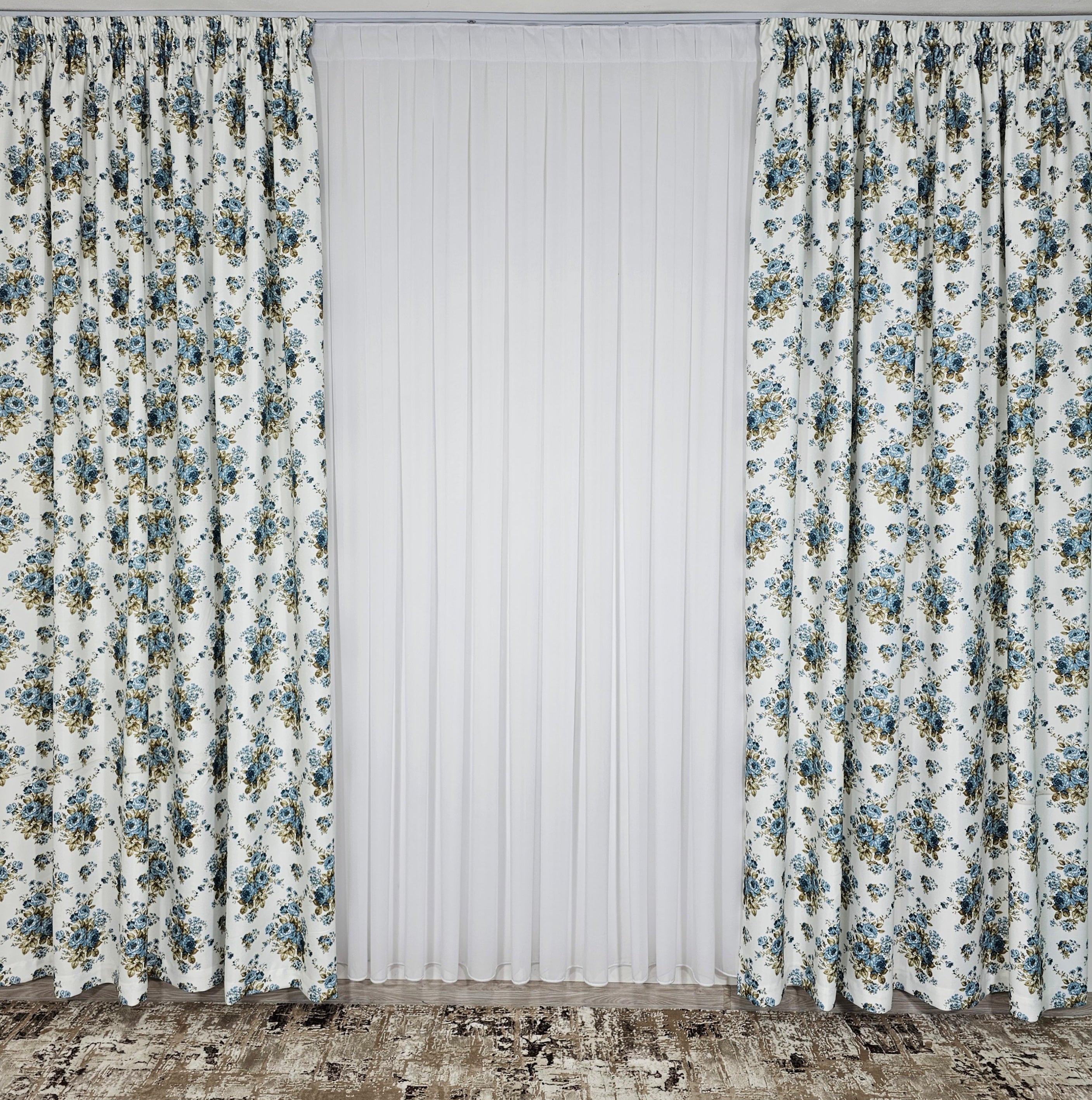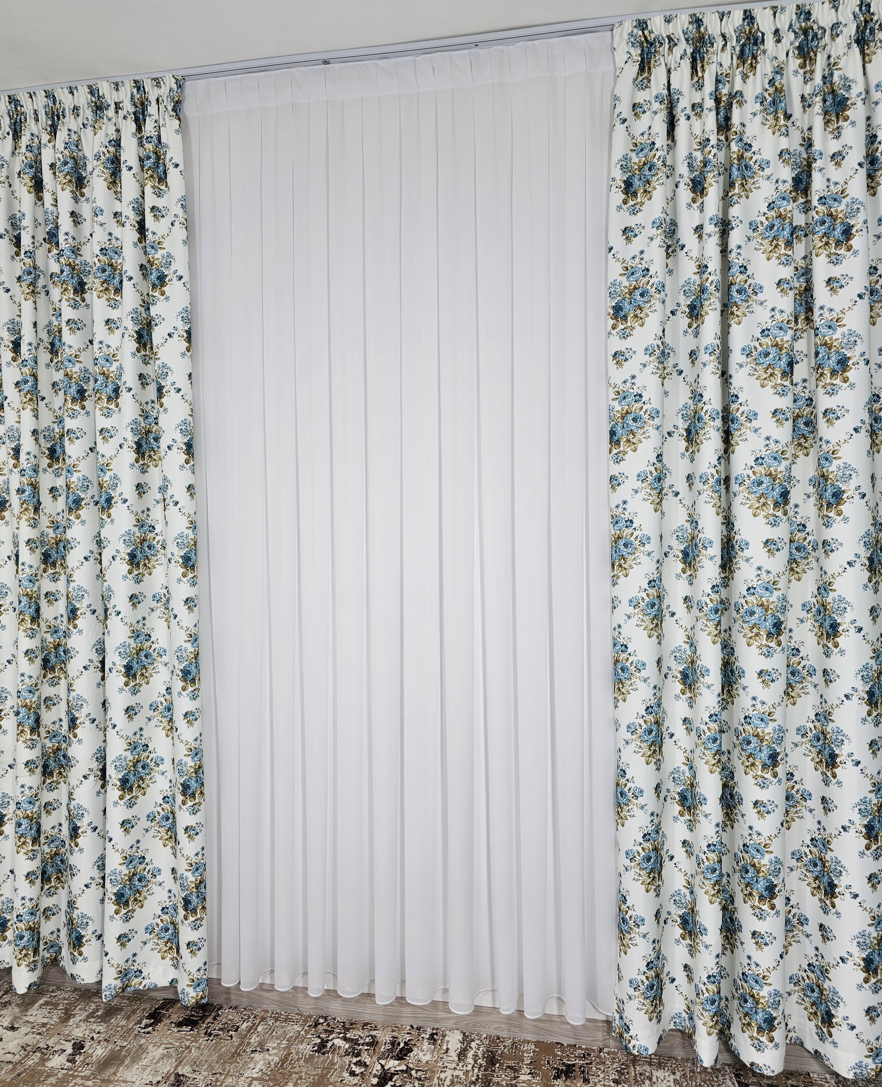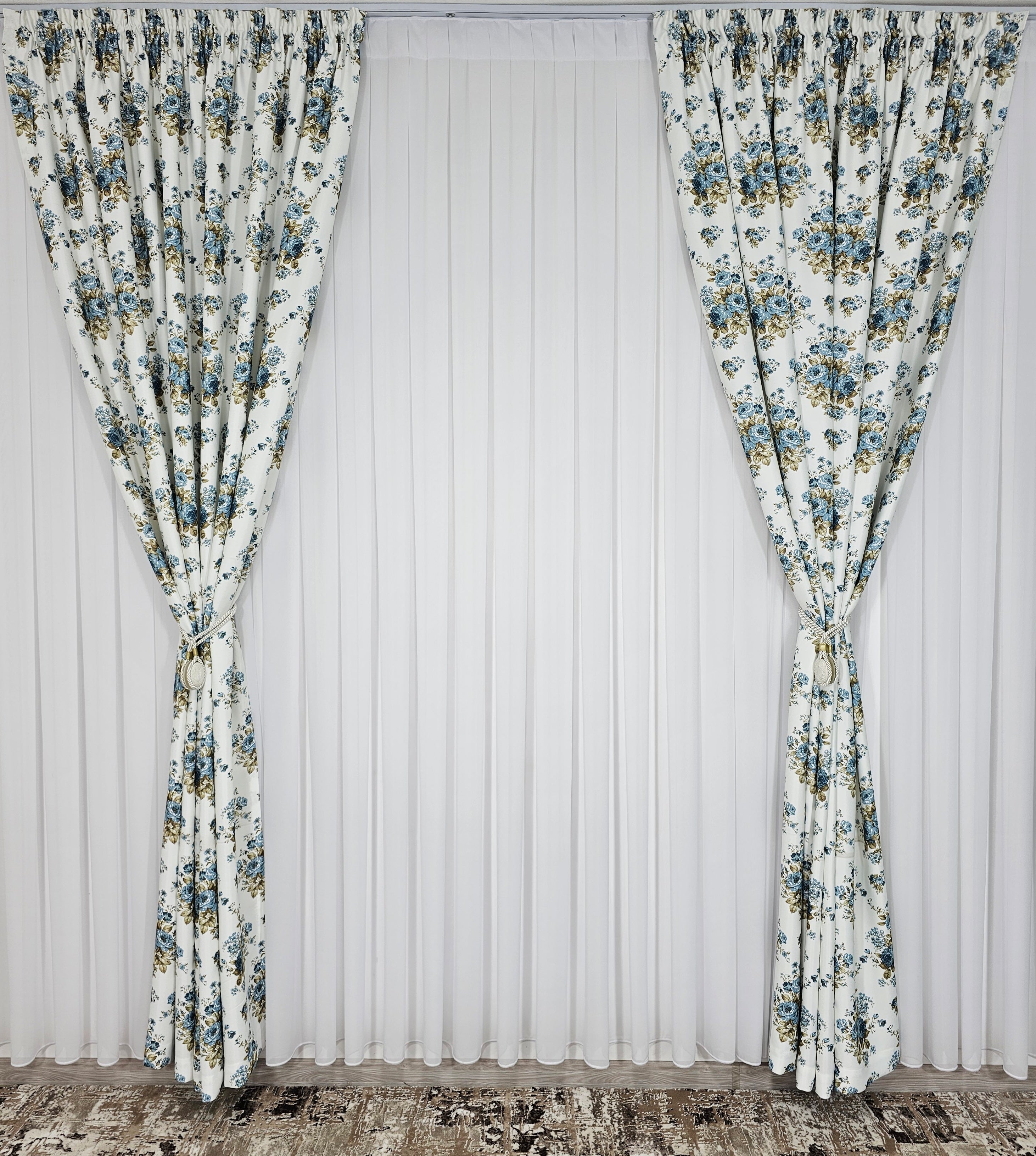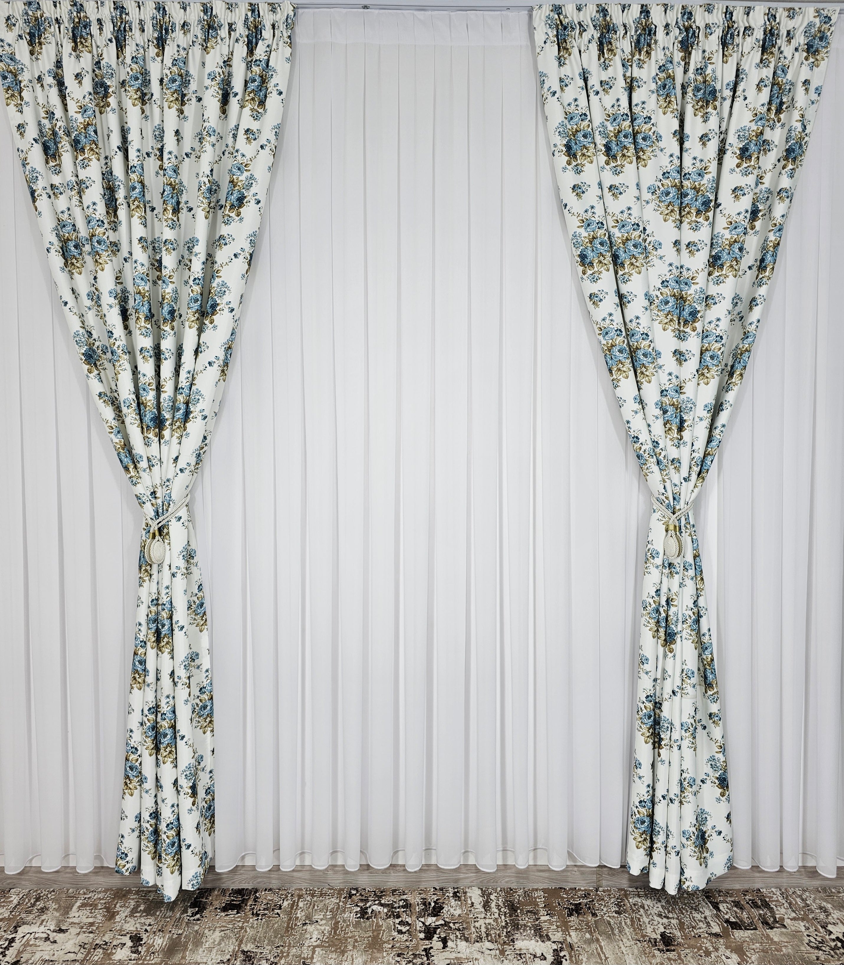 Un set plin de rafinament, format din perdea albă ușoară cu imprimeu floral și draperie asortată în același model, ideal pentru a adăuga prospețime, eleganță și armonie în decorul casei tale.