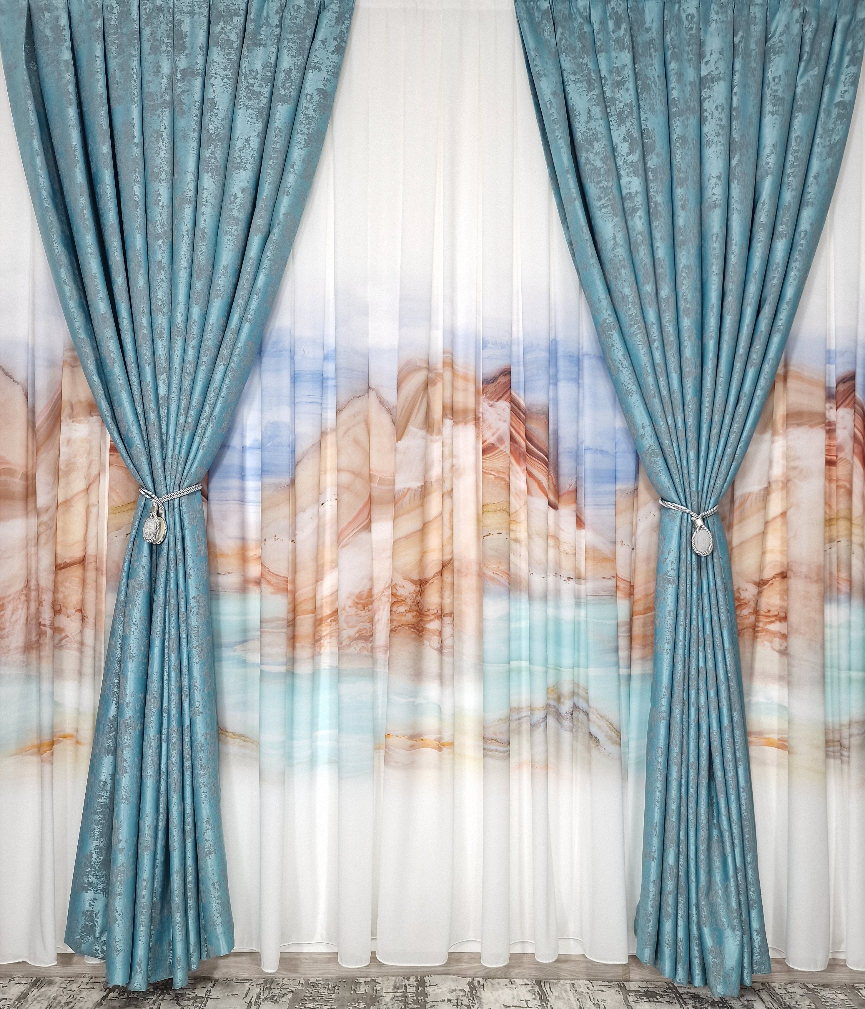Transformă-ți Spațiul cu Setul Nostru Unic de Perdea din Mătase Pictată cu Peisaj Marin și Draperie Soft Turcoaz