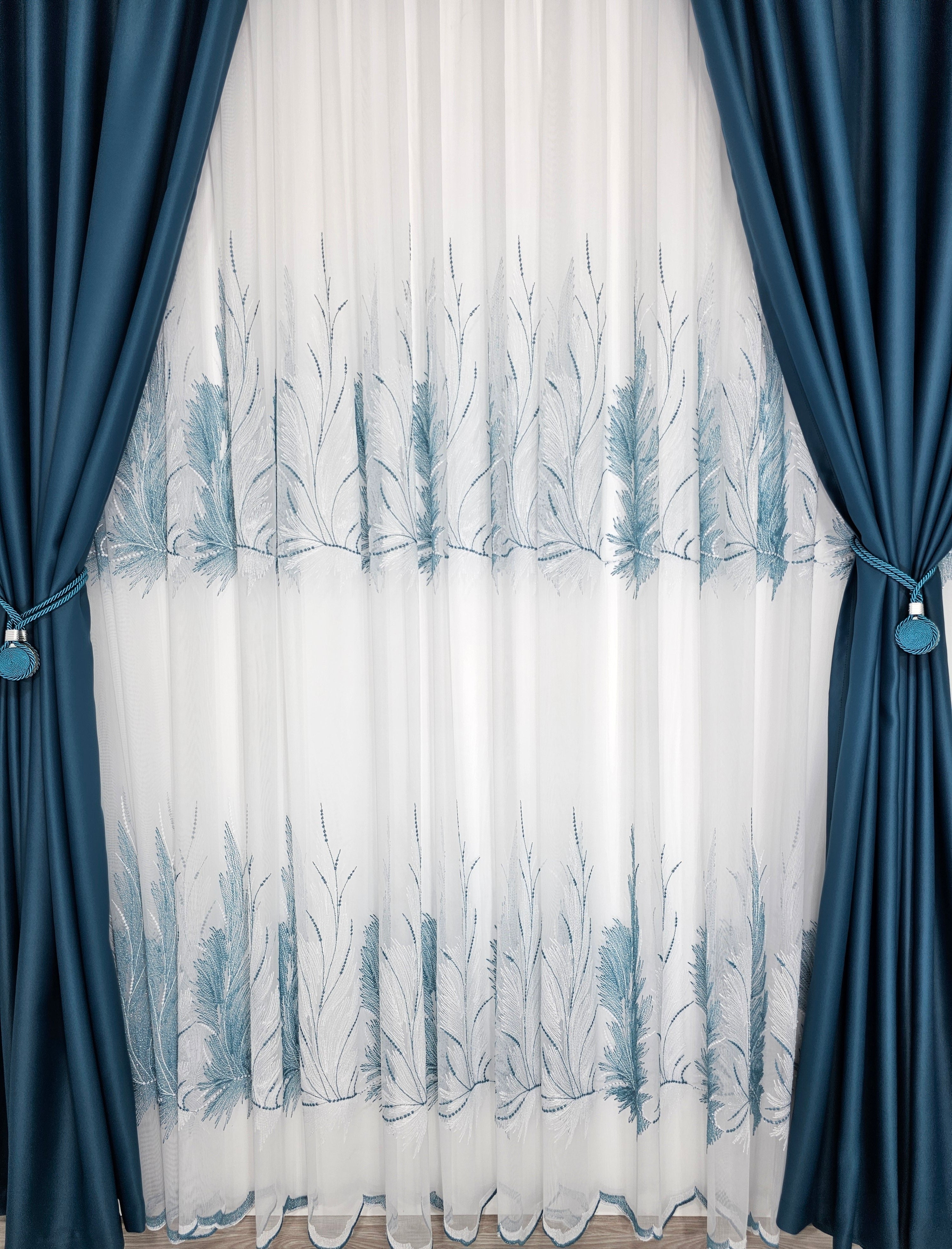 Design Elegant și Natural: Combinația de flori albe și turcoaz pe perdea și draperia turcoaz simplă creează un decor elegant și natural, potrivit pentru orice stil de amenajare interioară.