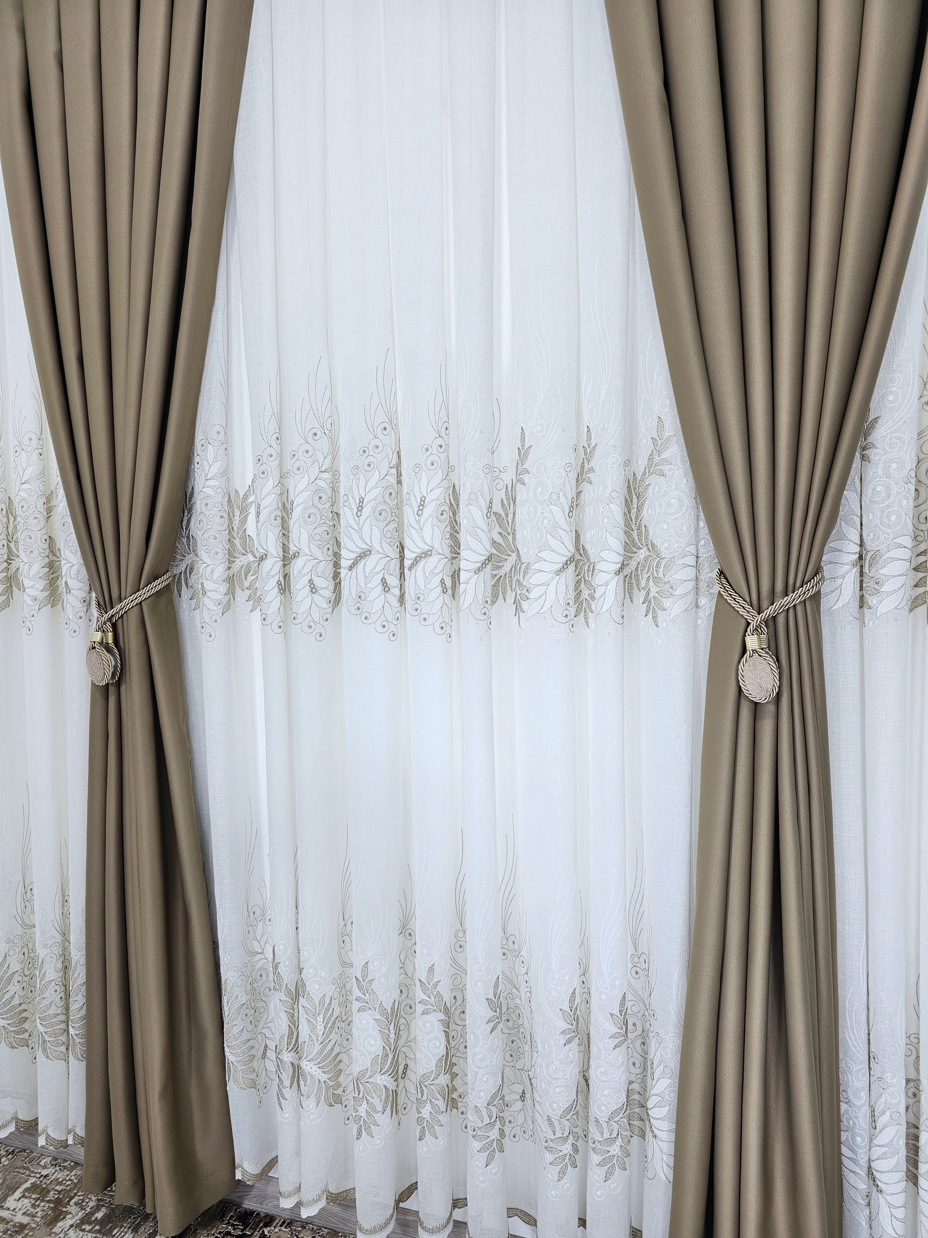 Design cu două borduri crem-bej: Aceste detalii subtile conferă perdelei un aspect rafinat, completând decorul cu o atingere clasică și elegantă.