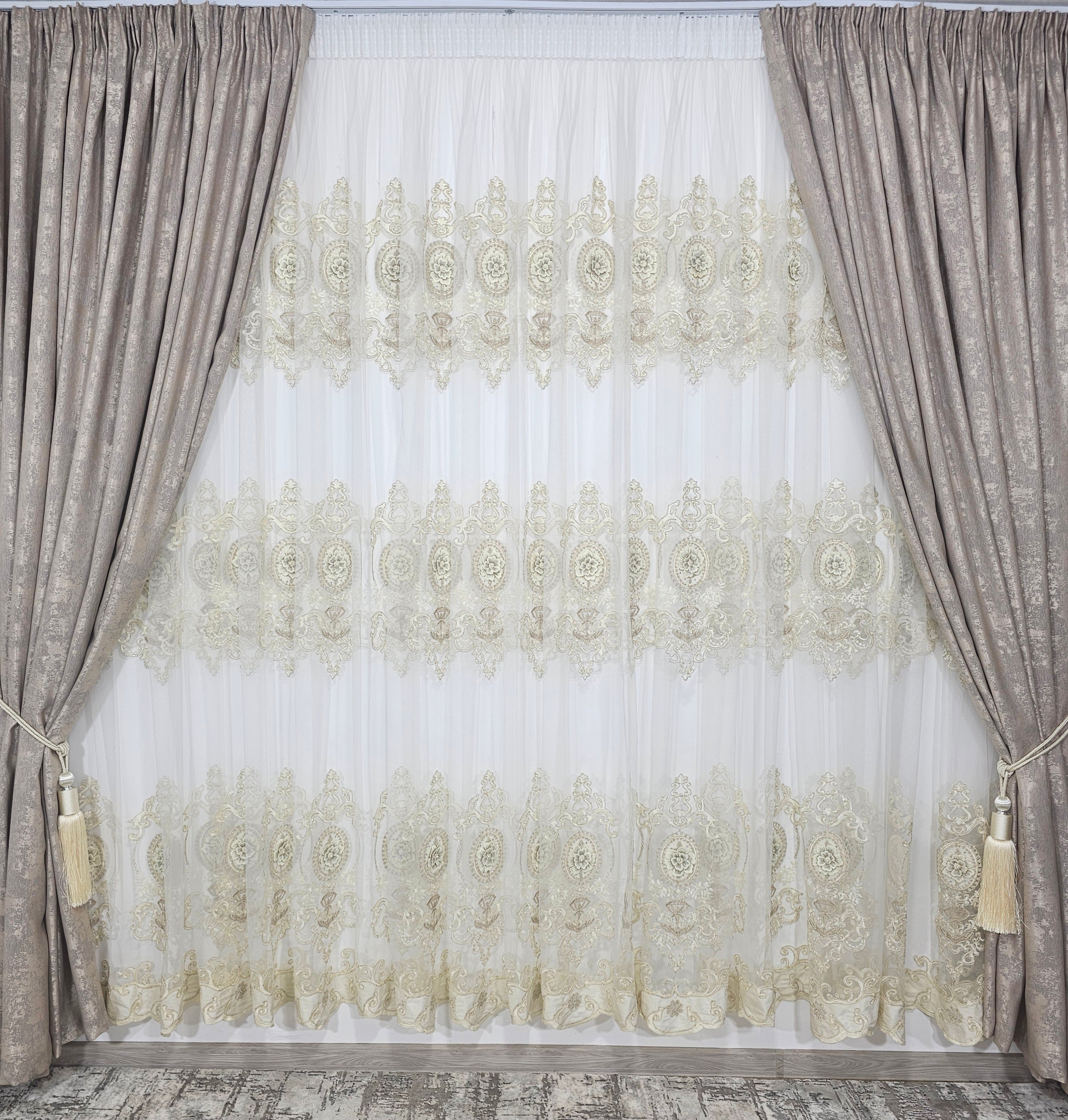 Descoperă un set de perdea și draperie care îmbină eleganța clasică cu funcționalitatea modernă. Perdeaua din tul cu broderie din catifea crem și draperia decorativă bej sunt perfecte pentru a adăuga un aer sofisticat și rafinat oricărui interior.