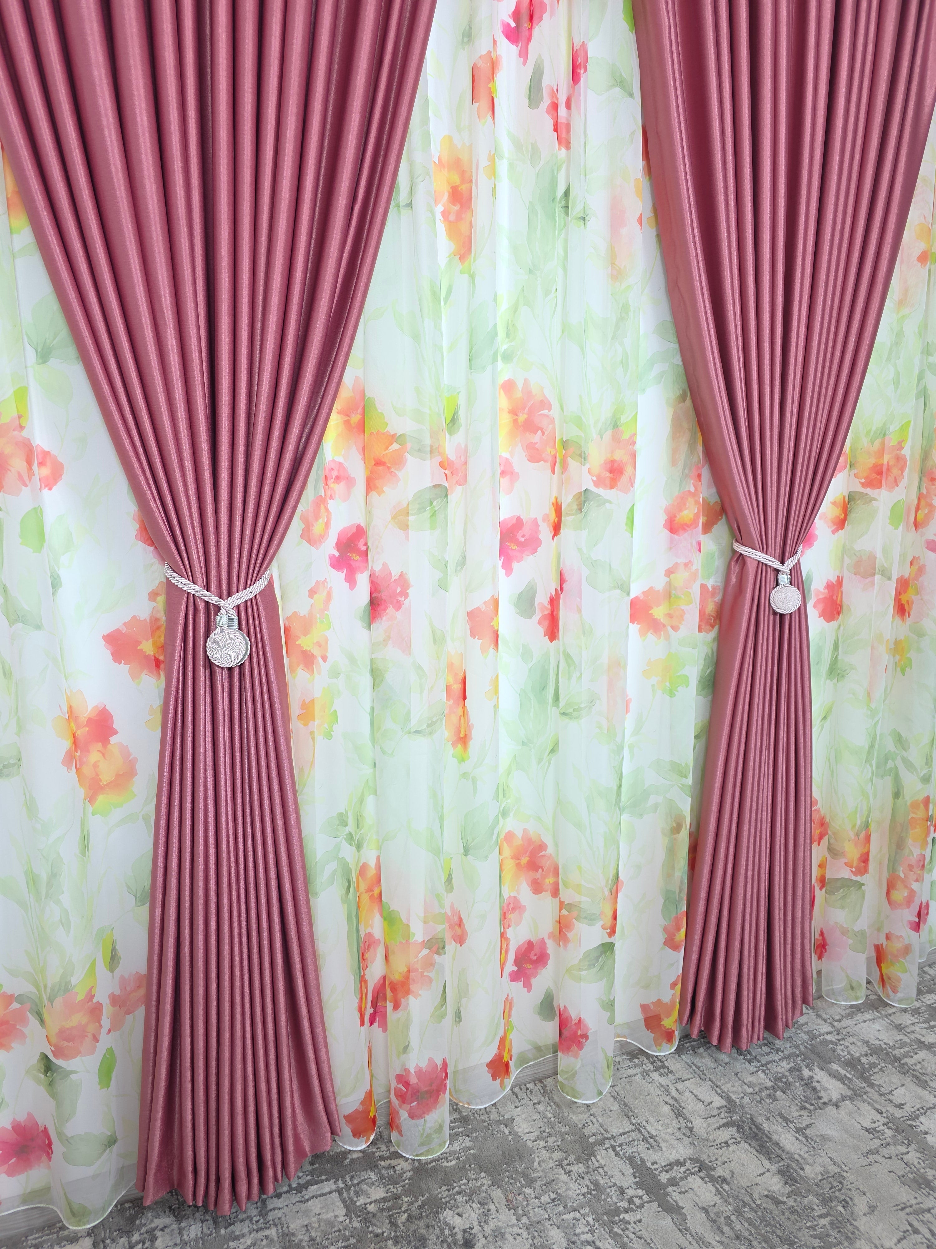 â–ª Perdea din voal alb cu imprimeu floral în nuanțe de verde crud, roz, corai și oranj â–ª Material aerisit, care filtrează lumina naturală, creând o atmosferă caldă și luminoasă â–ª Draperie roze cu textură plină, ușor semiopacă – ideală pentru un plus de intimitate fără a bloca complet lumina â–ª Aspect elegant, ușor lucios – conferă profunzime decorului â–ª Culoare roz-prafuit care oferă un aer romantic și rafinat întregii încăperi â–ª Se poate monta ușor – prindere pe șină sau galerie (la alegere)