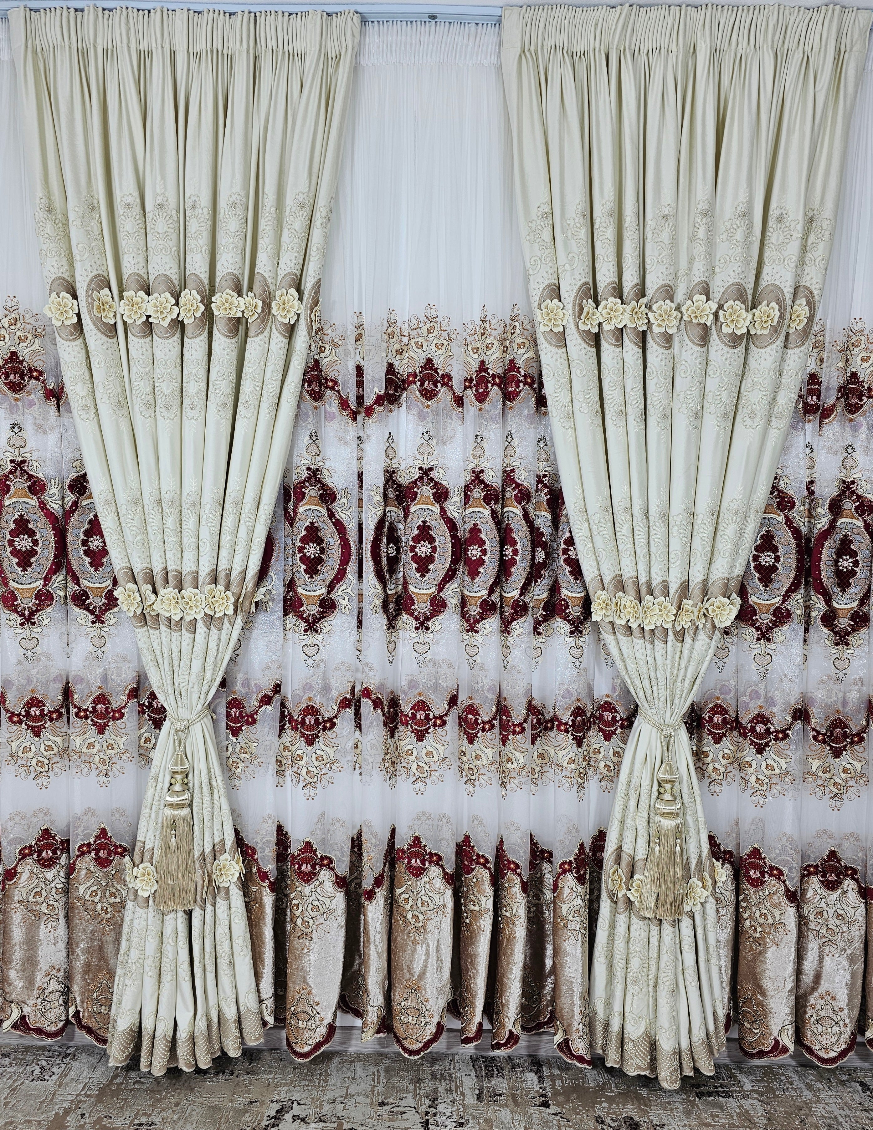 Perdea din Tul cu Broderie Roșie 3D și Draperie din Catifea Crem 3D â¤ï¸ðŸ¤âœ¨