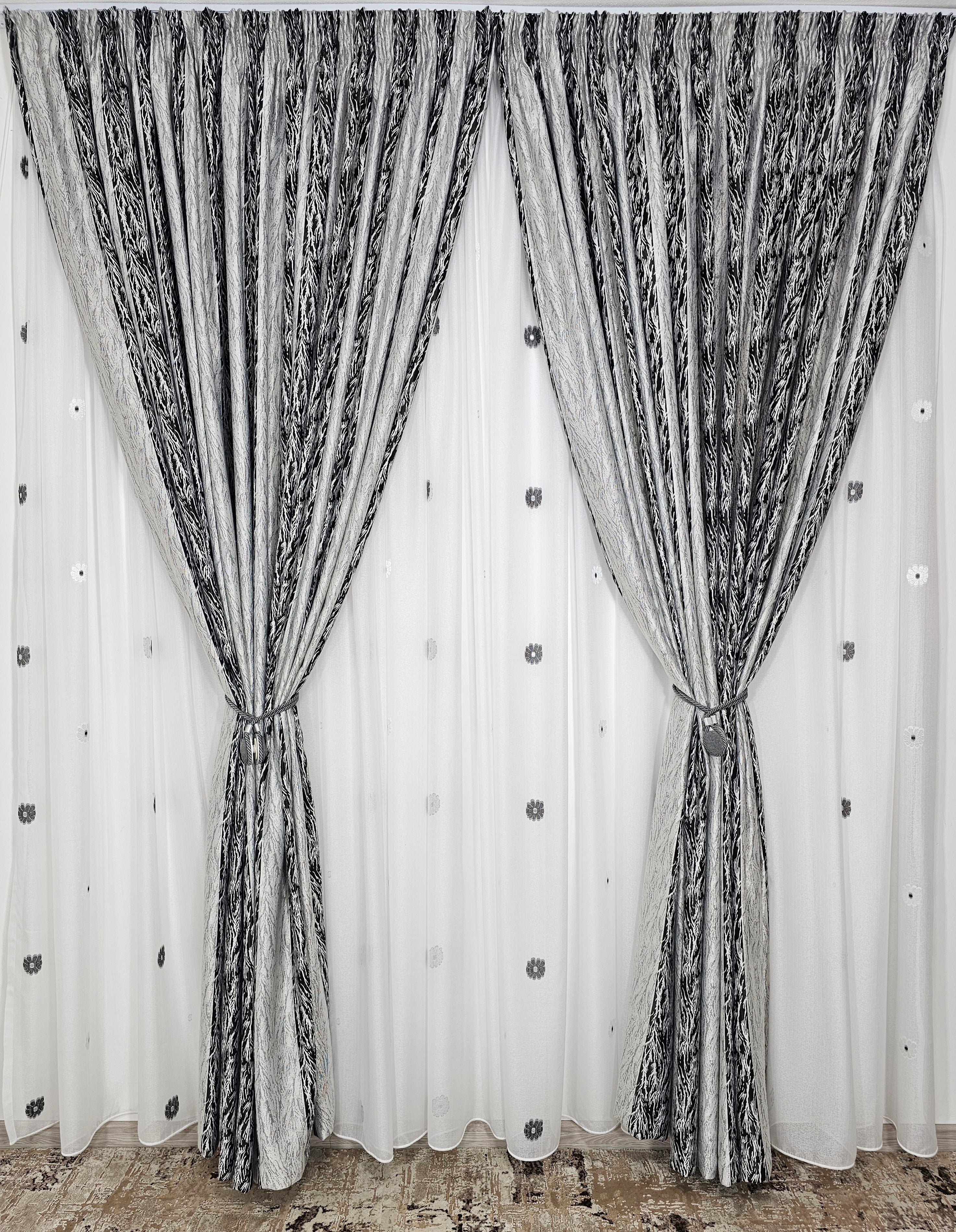 Un set rafinat ce îmbină naturalețea unei perdele din in cristal alb cu imprimeu floral în nuanțe alb-gri cu eleganța unei draperii blackout gri-negru, perfect pentru interioare moderne și sofisticate.