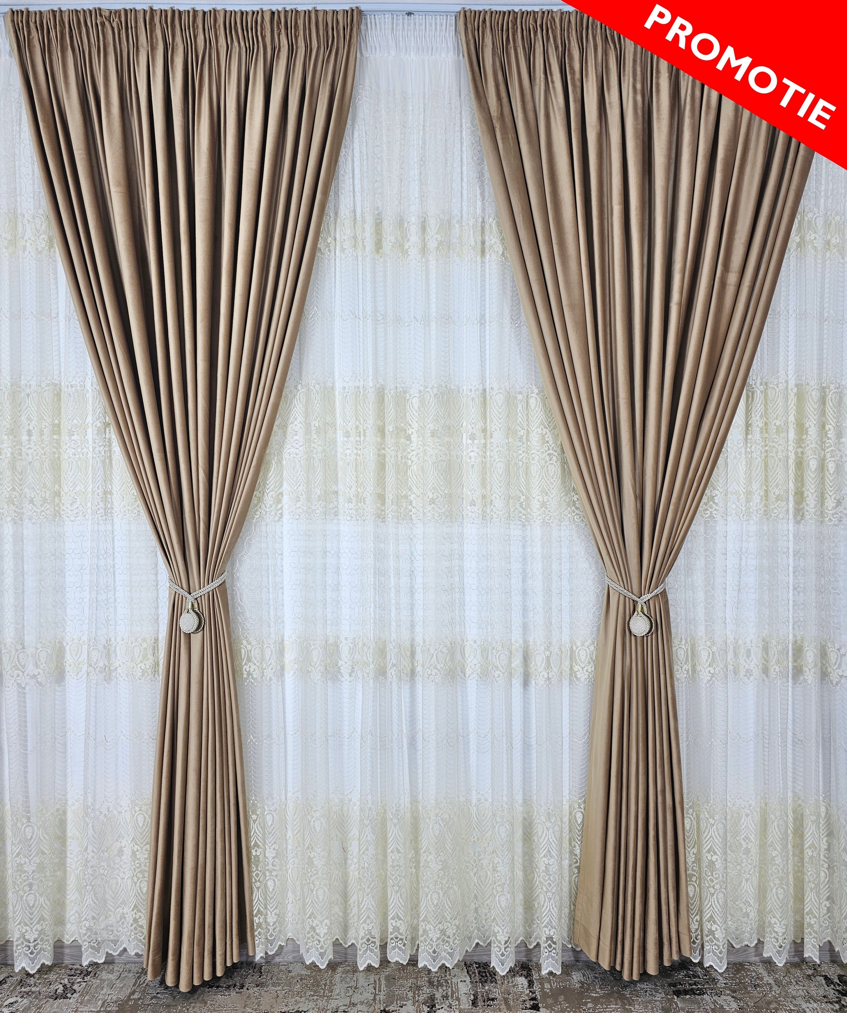 Set Perdea din Tul cu Broderie Crem și Draperie din Catifea Culoarea Mierii – Eleganță Clasică și Căldură Primitoare