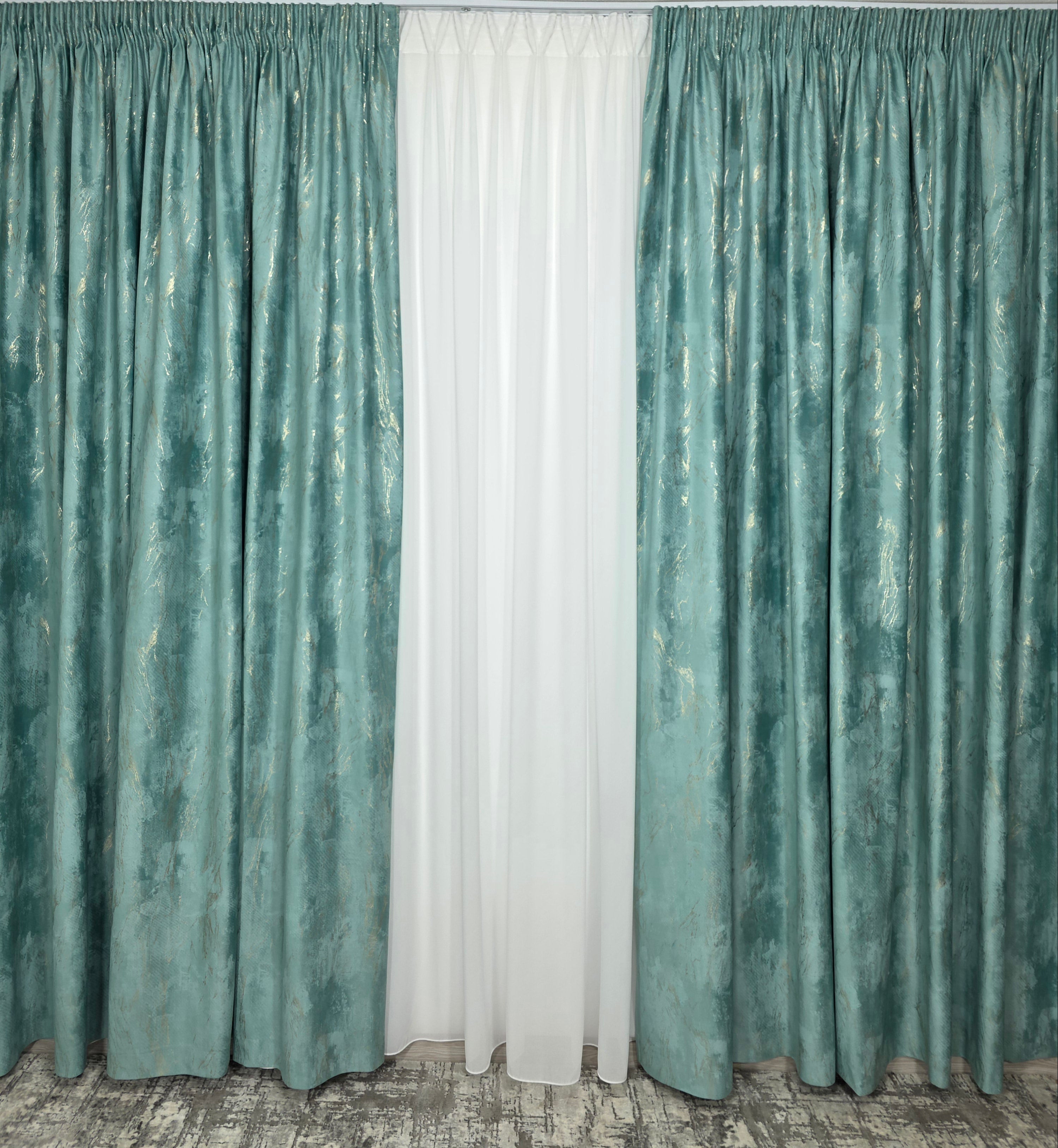Un set elegant și sofisticat, alcătuit din perdea albă din material tip mătase imaculat, cu textură fină și nesifonabilă, și draperie din catifea verde mentă, decorată cu inserții aurii subtile, ideal pentru un decor rafinat și modern.