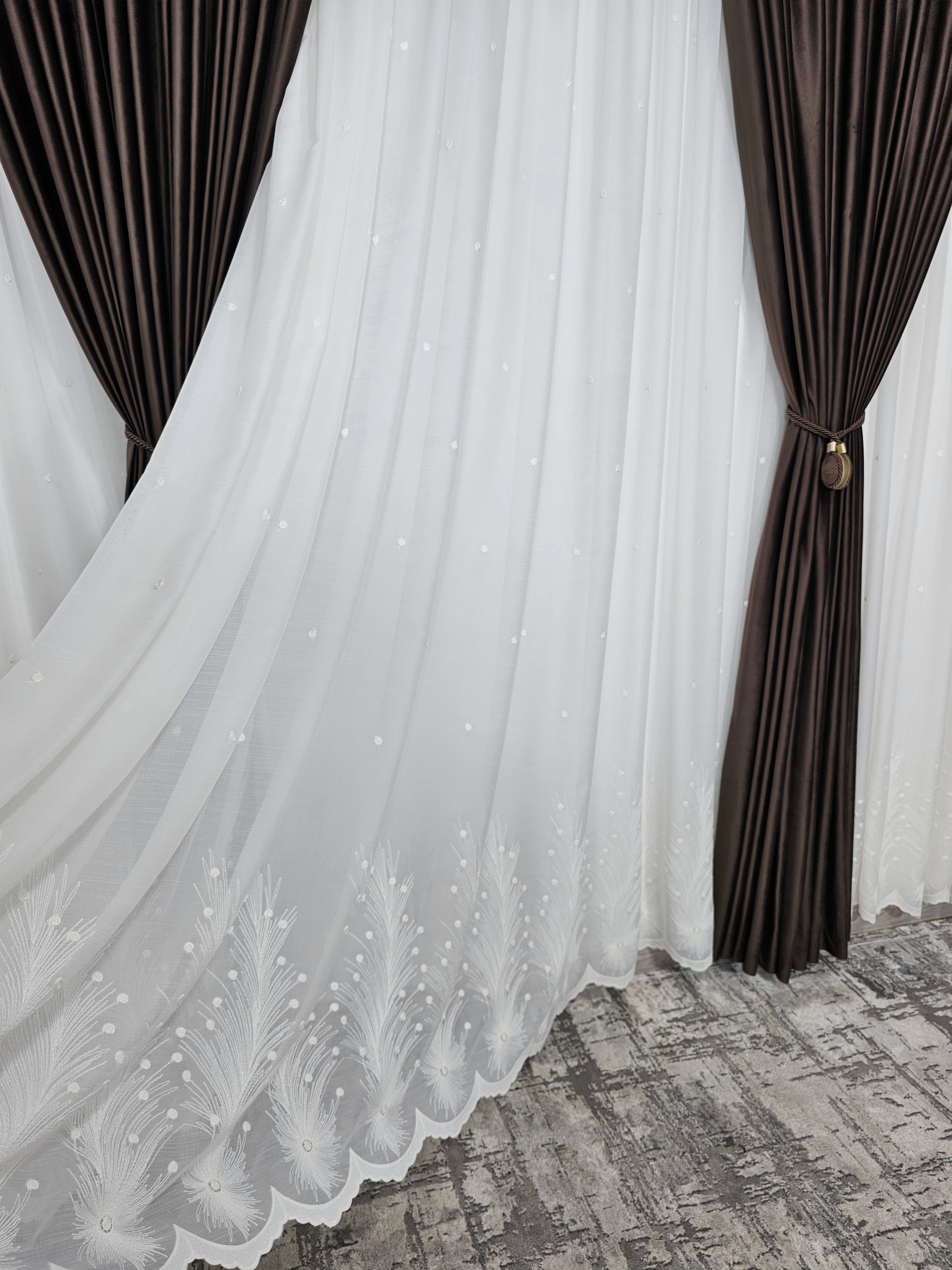 Transformă-ți locuința într-un spațiu sofisticat și elegant cu acest set format din perdea crem cu flori crem și draperie din catifea maro închis. Ideal pentru interioare ce îmbină rafinamentul și funcționalitatea, acest set aduce un plus de căldură și stil în orice cameră.